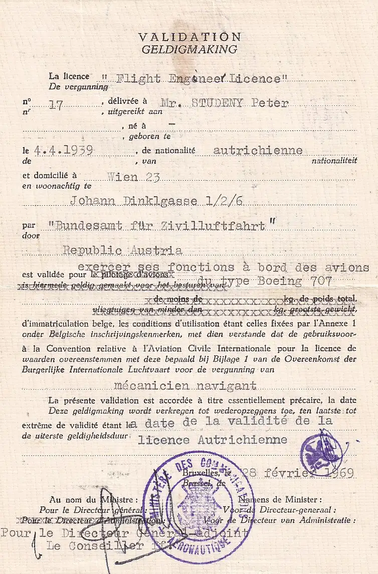 60029 - Belgien - Certificat de Validation , Flight Engineer Licence - 1969