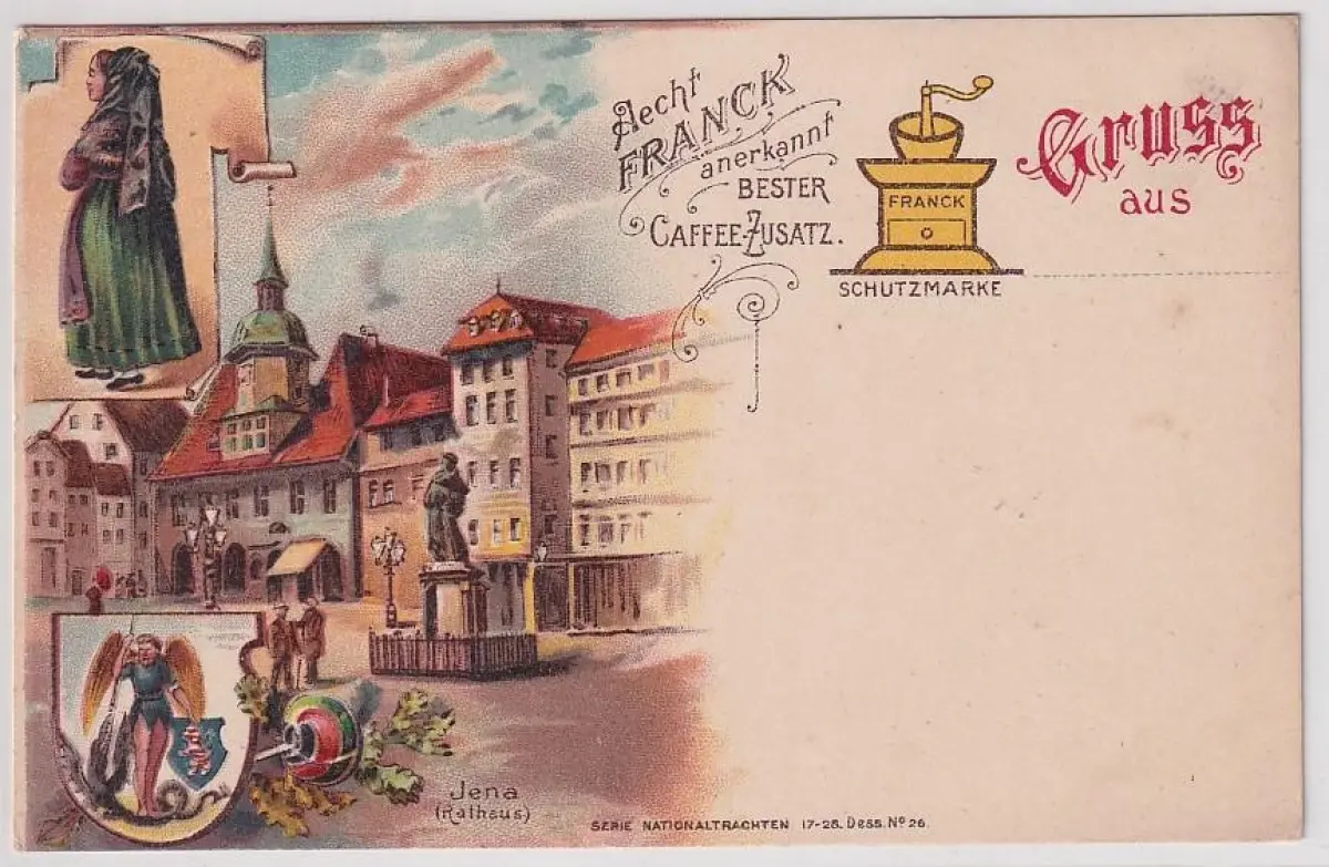 60886 Franck Kaffee Reklame Ak Lithographie Gruß aus Jena Rathaus um 1900