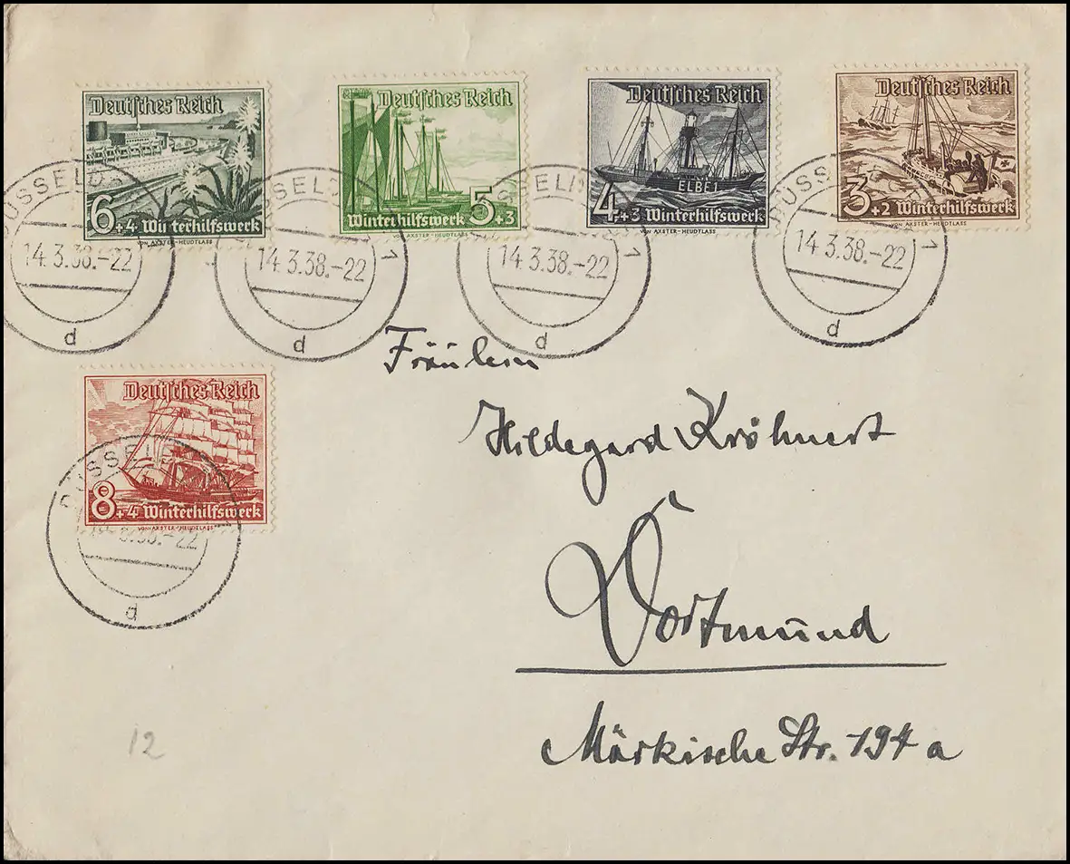 651-655 WHW Schiffe 3 bis 8 Pf auf Brief, 5 Werte, DÜSSELDORF 14.3.1938