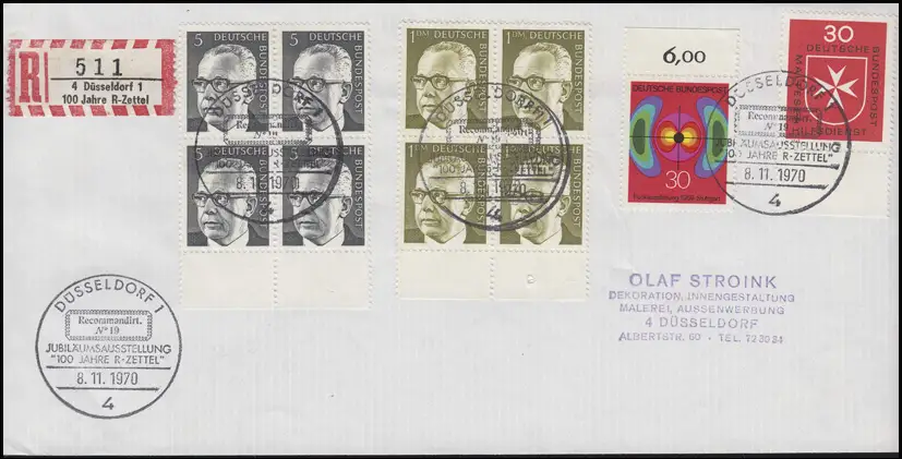 Sonder-R-Zettel "100 Jahre R-Zettel" mit passenden Sonderstempel DÜSSELDORF "Jubiläumsausstellung 100 Jahre R-Zettel - 8.11.1970", auf Orts-R-Brief