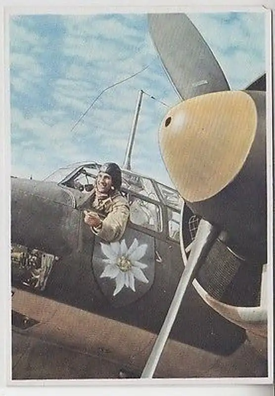 Bild 5 aus der Serie, "Eine Junkers Ju 88 (mit Staffelabzeichen) kehrt erfolgreich von ihrem Einsatz gegen den Feind zurück. Mit lachendem Gesicht berichtet ihr Führer von seinen Erfolgen am Feind. ungelaufen, gute Erhaltung siehe Bild,