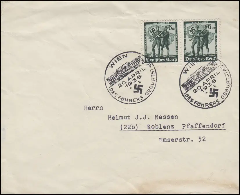 663 Volksabstimmung in Österreich, Paar auf Brief SSt WIEN Geburtstag 20.4.1938