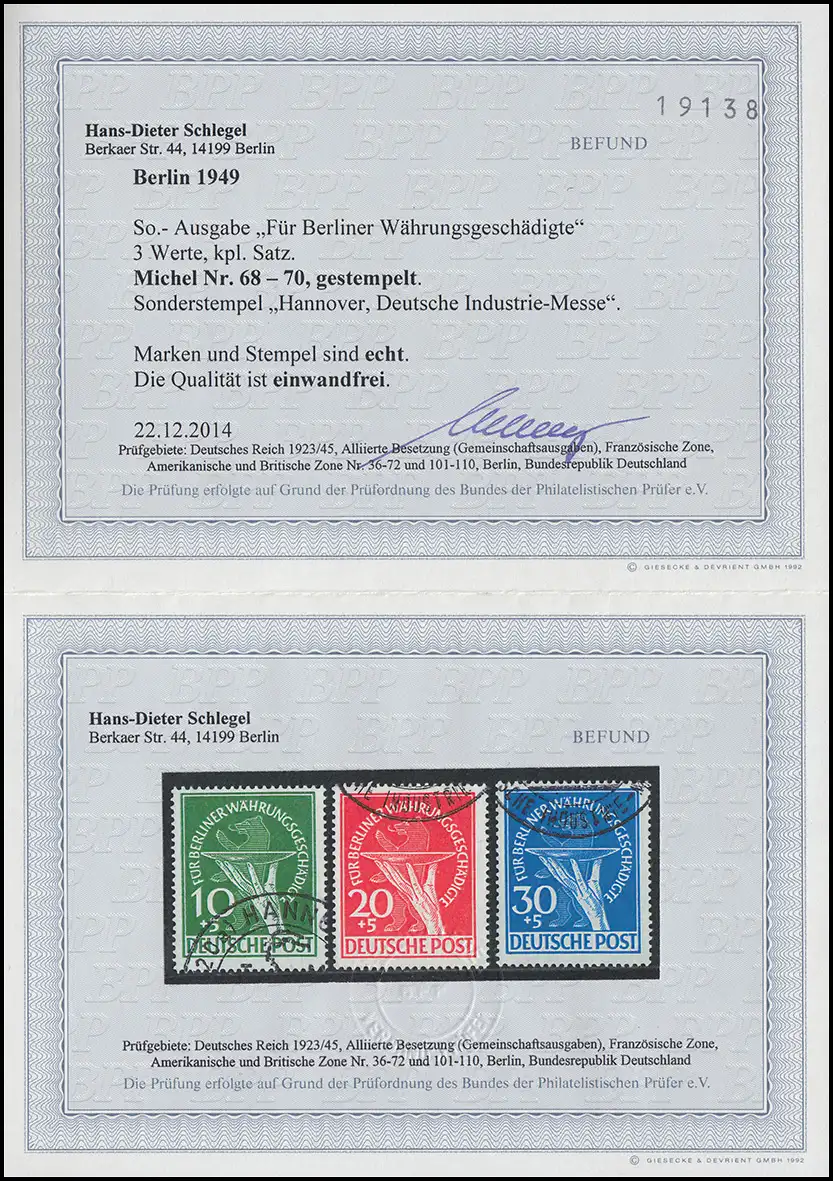 68-70 Währungsgeschädigte - Satz Sonderstempel, Befund Schlegel BPP