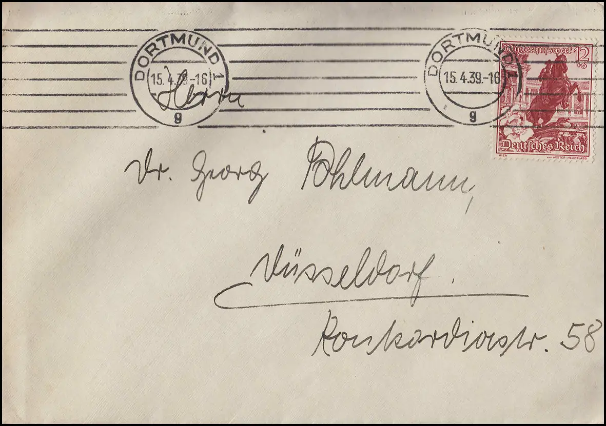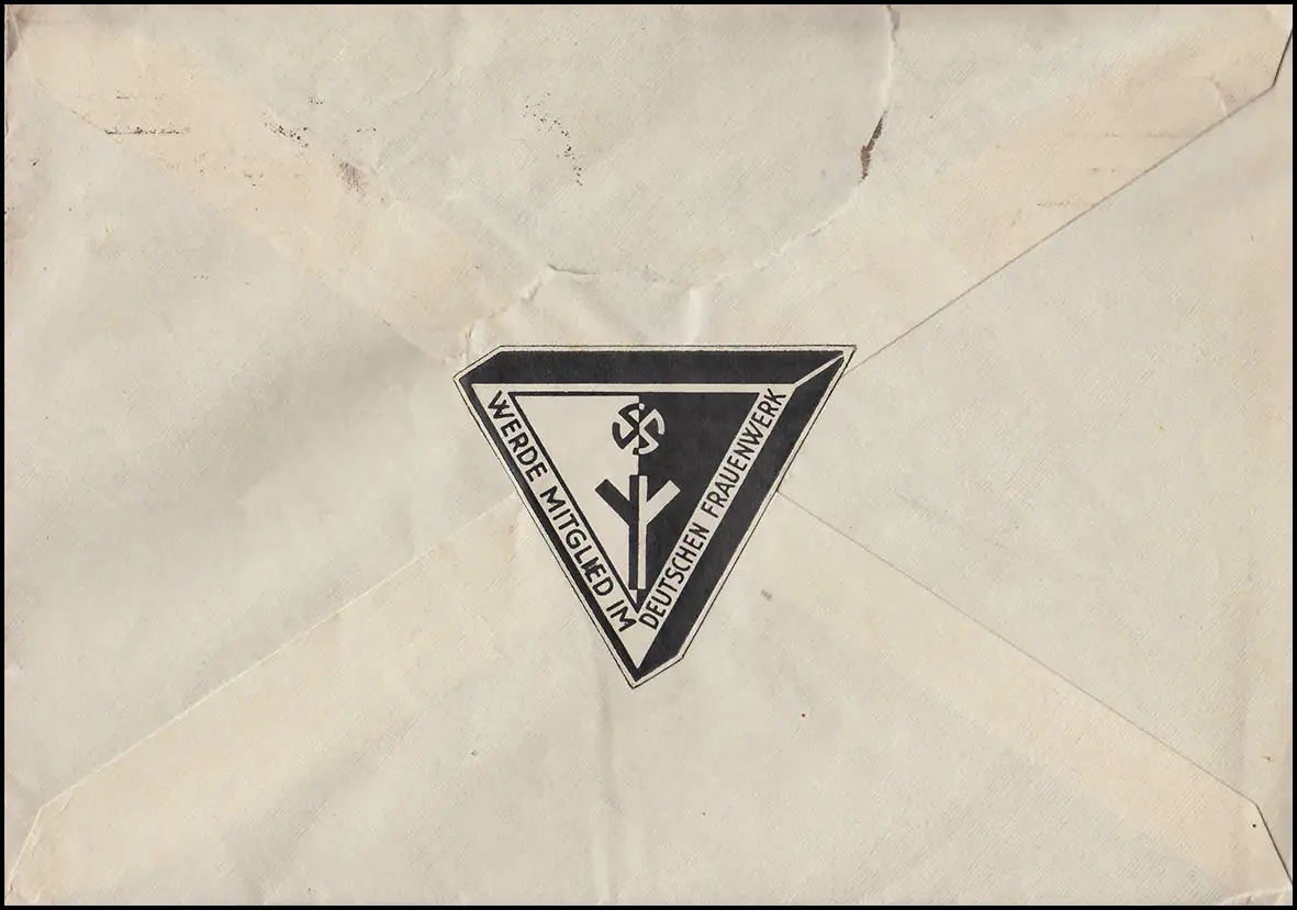 portogerechte Einzelfrankatur auf Fernbrief nach Düsseldorf, rückseiitg Vignette "Werde Mitglied im Deutschen Fruanewerk", Rückklappe defekt / Absenderangaben ausgerissen