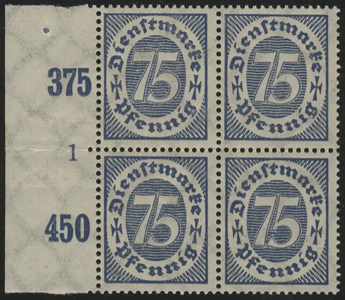 69 Dienstmarke 75 Pf Rand-Viererblock mit Formnummer 1, gefaltet **
