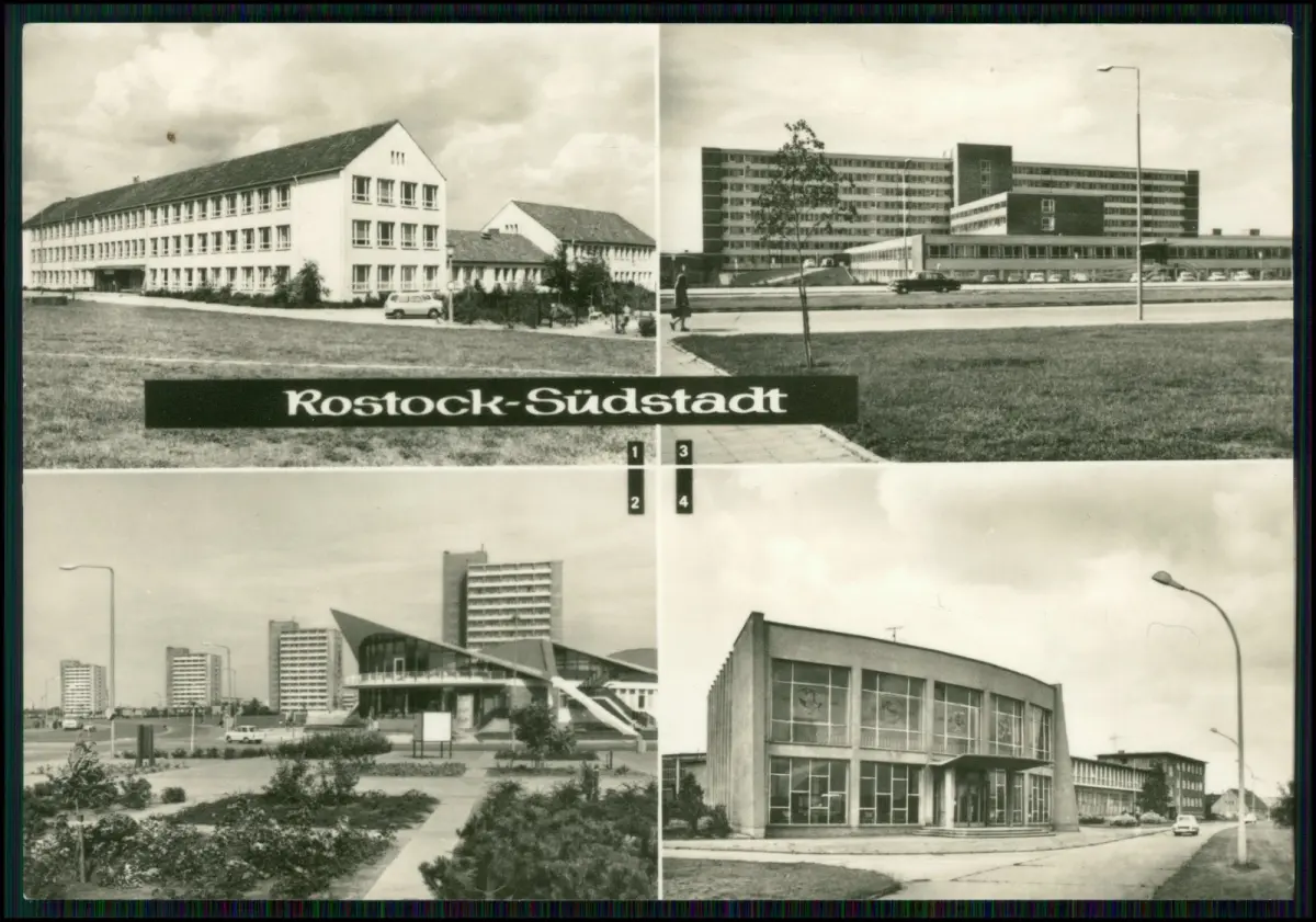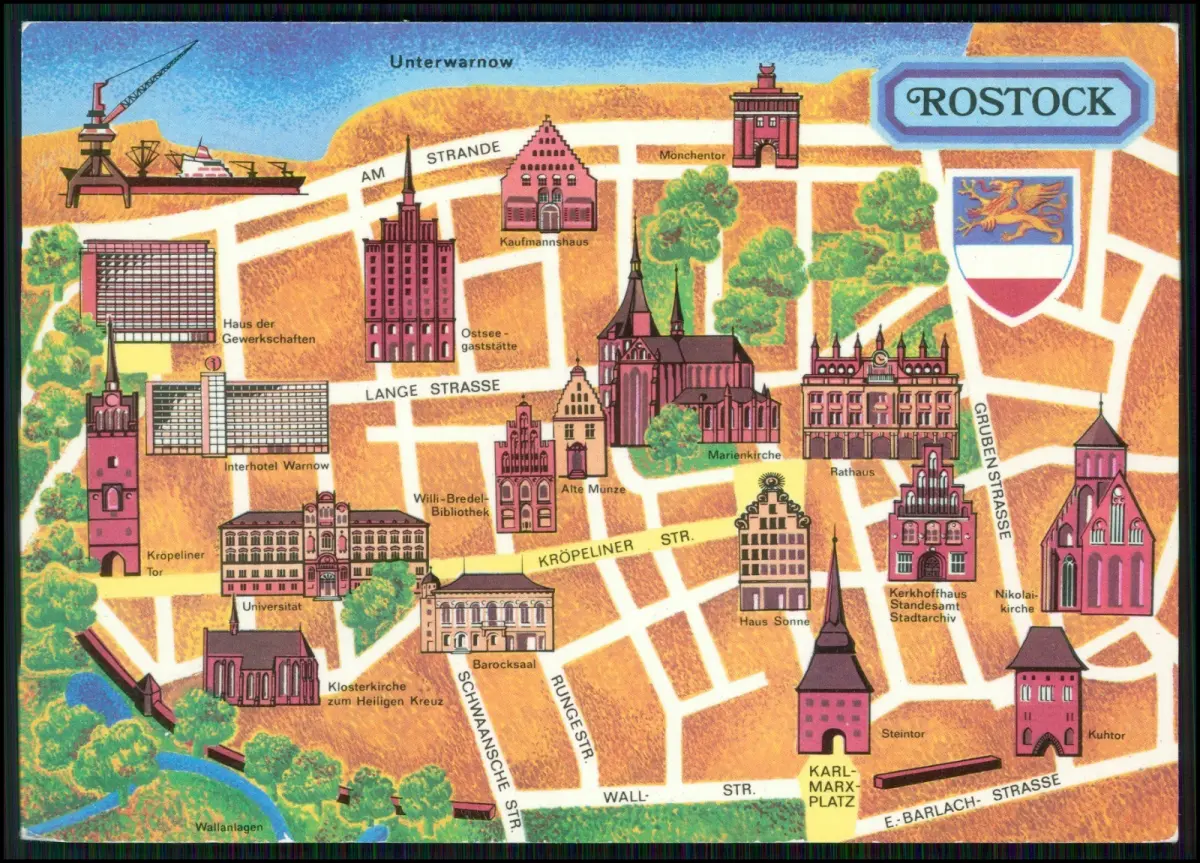 6x Postkarten aus Rostock, mit detailreichen Motiven von Altstadt, Hafen, Marienkirche und Fischerhäusern. Die Ansichten zeigen das maritime Leben an der Ostsee in der DDR-Zeit und dokumentieren die städtebauliche Entwicklung Rostocks im 20. Jahrhundert