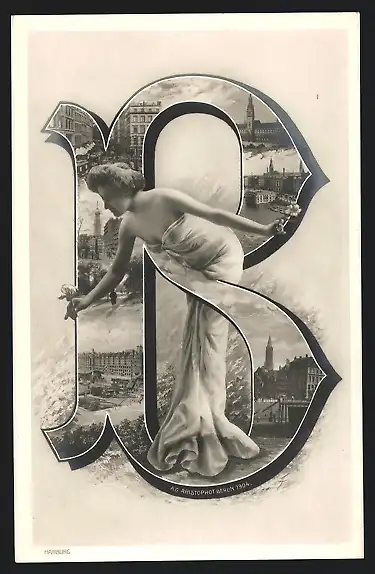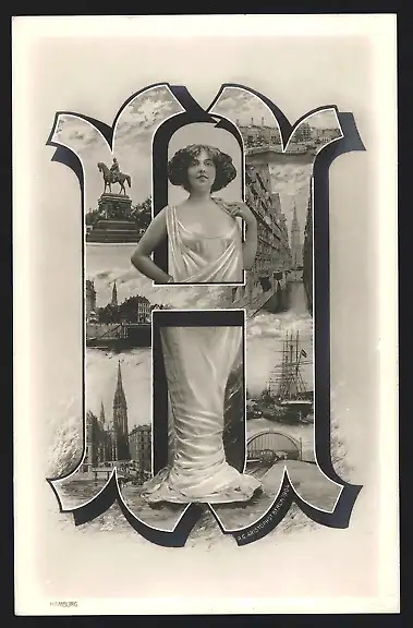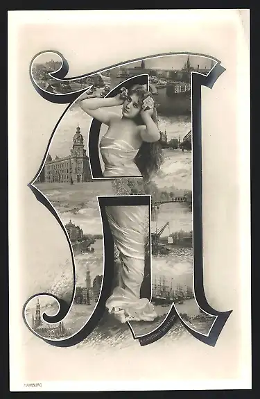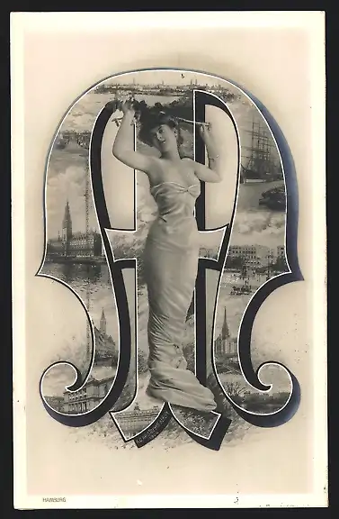 7 AK Hamburg, Serie von 7 Karten mit Ansichten in den Buchstaben des Stadtnamens, Schöne Frauen in Pose