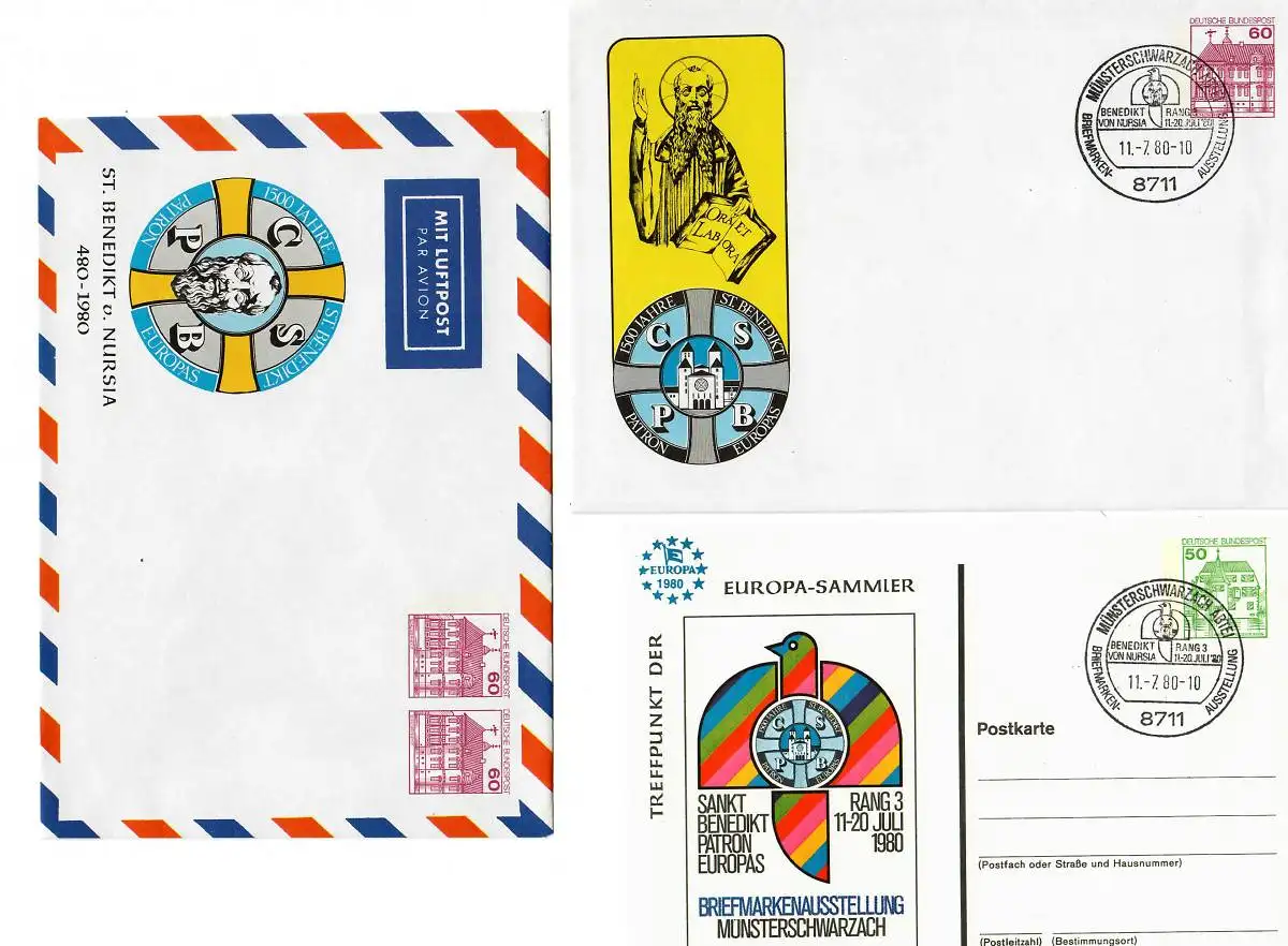 7 verschiedene Ganzsachen/Postkarten, Sonderstempel Münsterschwarzach 1980