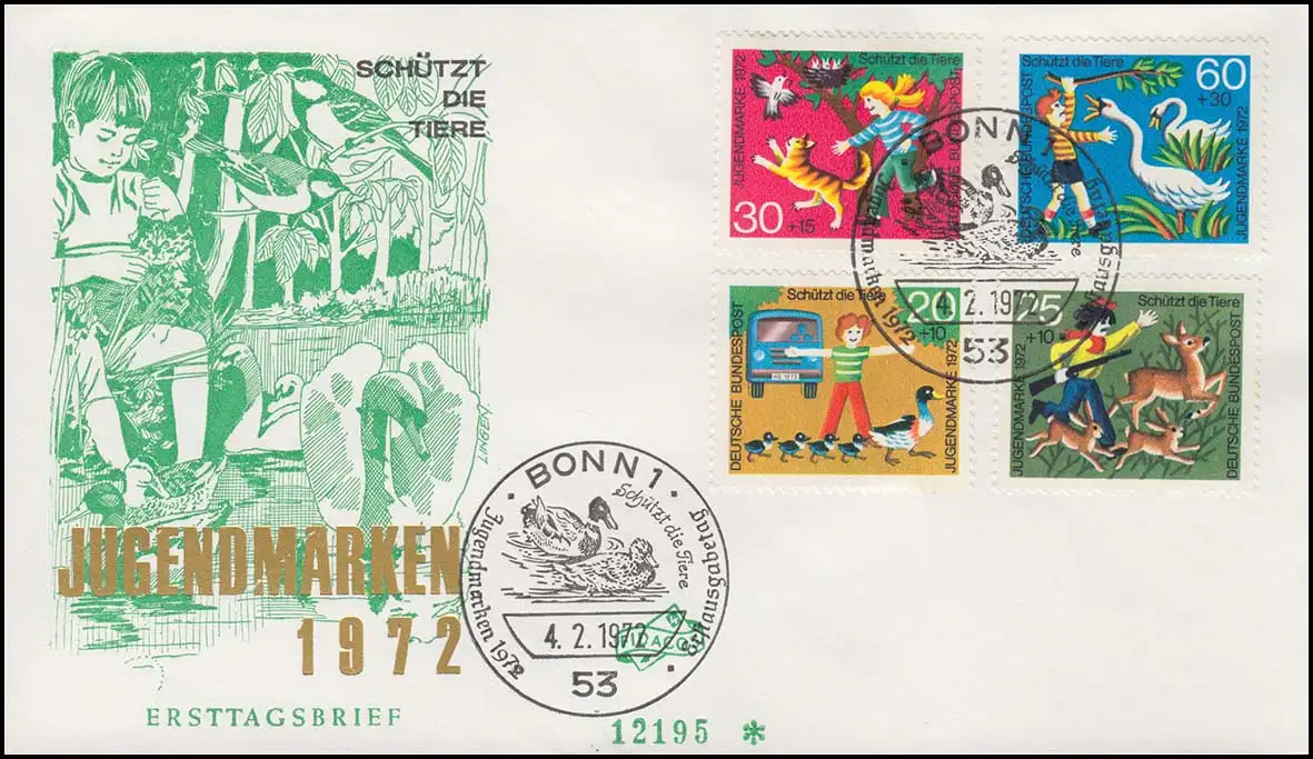 711-714 Jugend 1972 Tierschutz kpl. Satz auf Schmuck-FDC BONN 4.2.1972