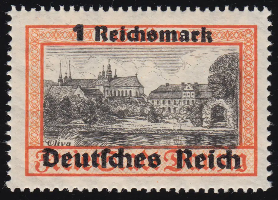 728I Danzig mit Aufdruck 1 RM - Plattenfehler Strich im O, i mit Schatten - **