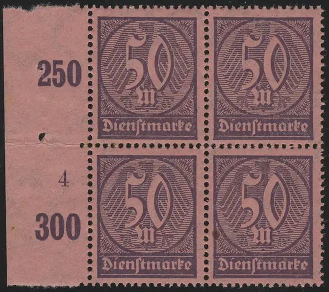 73 Dienstmarke 50 M. Rand-Viererblock mit Formnummer 4, waagerecht gefaltet **