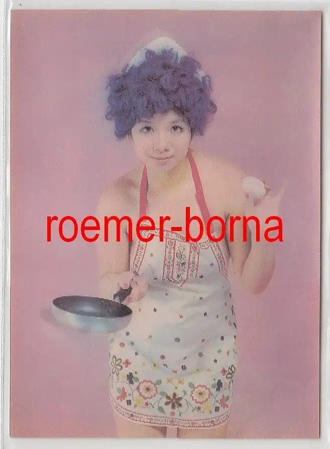 wandelbare 3 D Karte nackte Frau mit einer Schürze bekleidet und einer Bratpfanne und einem Ei in der Hand gekippt ist sie nackt von der Seite zu sehen und in der Pfanne sitzt ein Küken ungelaufen (aber beschrieben) guter Zustand, siehe Bild