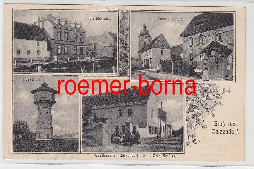 Ortsrichteramt, Kirche u. Schule, Wasserturm, Gasthaus zu Calzendorf Inh. Otto Seiler gelaufen guter Zustand, leichte Altersspuren, siehe Bild