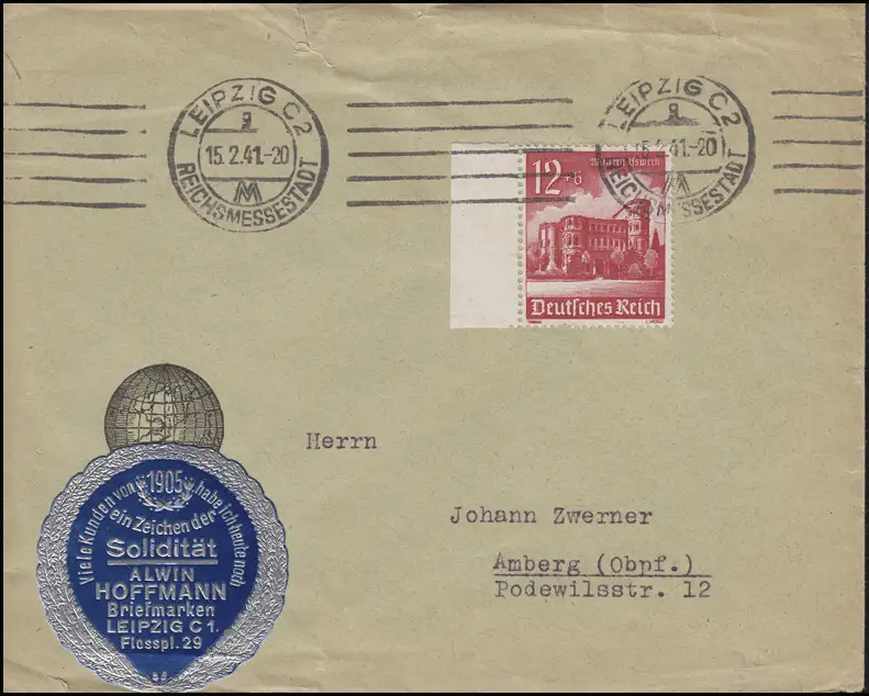 Marke mit Rand auf Fernbrief nach Amberg. Oben Einriss.