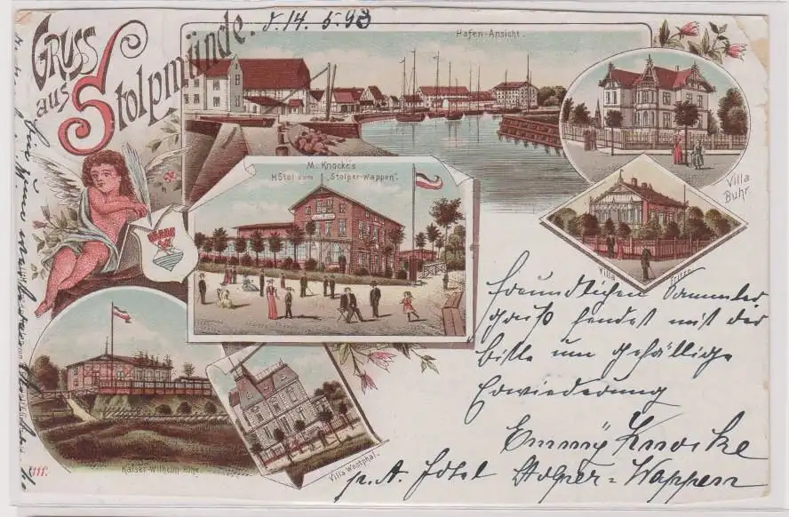 75683 Ak Lithographie Gruß aus Stolpmünde Ustka in Pommern Hotel usw. 1898