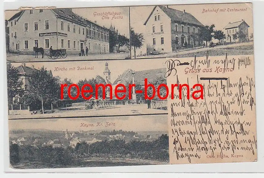 Geschäftshaus Otto Fuchs, Bahnhof mit Restaurant, Kirche mit Denkmal, Kayna Kr. Zeitz gelaufen gute Erhaltung, leichte Altersspuren, siehe Bild