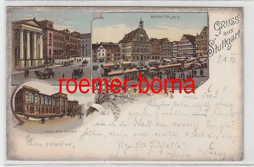 76624 Ak Lithografie Gruss aus Stuttgart Post, Marktplatz, Neue Bibliothek 1901