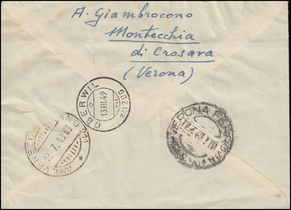 Auslandsbrief mit Einschreibe-Not-Zettel "Montecchia di Crosara" nach OBERWIL bei ZUG 13.7.49