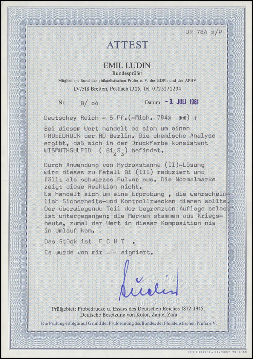 Interessante Attestierung des damaligen Bundesprüfers Ludin aus dem Jahre 1981 eines Probedrucks der Reichsdruckerei. Auch wenn die dort dargestellten Gegebenheiten heute nicht mehr aktuell und für den philatelistischen Markt praktikabel sind - eine Bereicherung für jede Spezialsammlung.