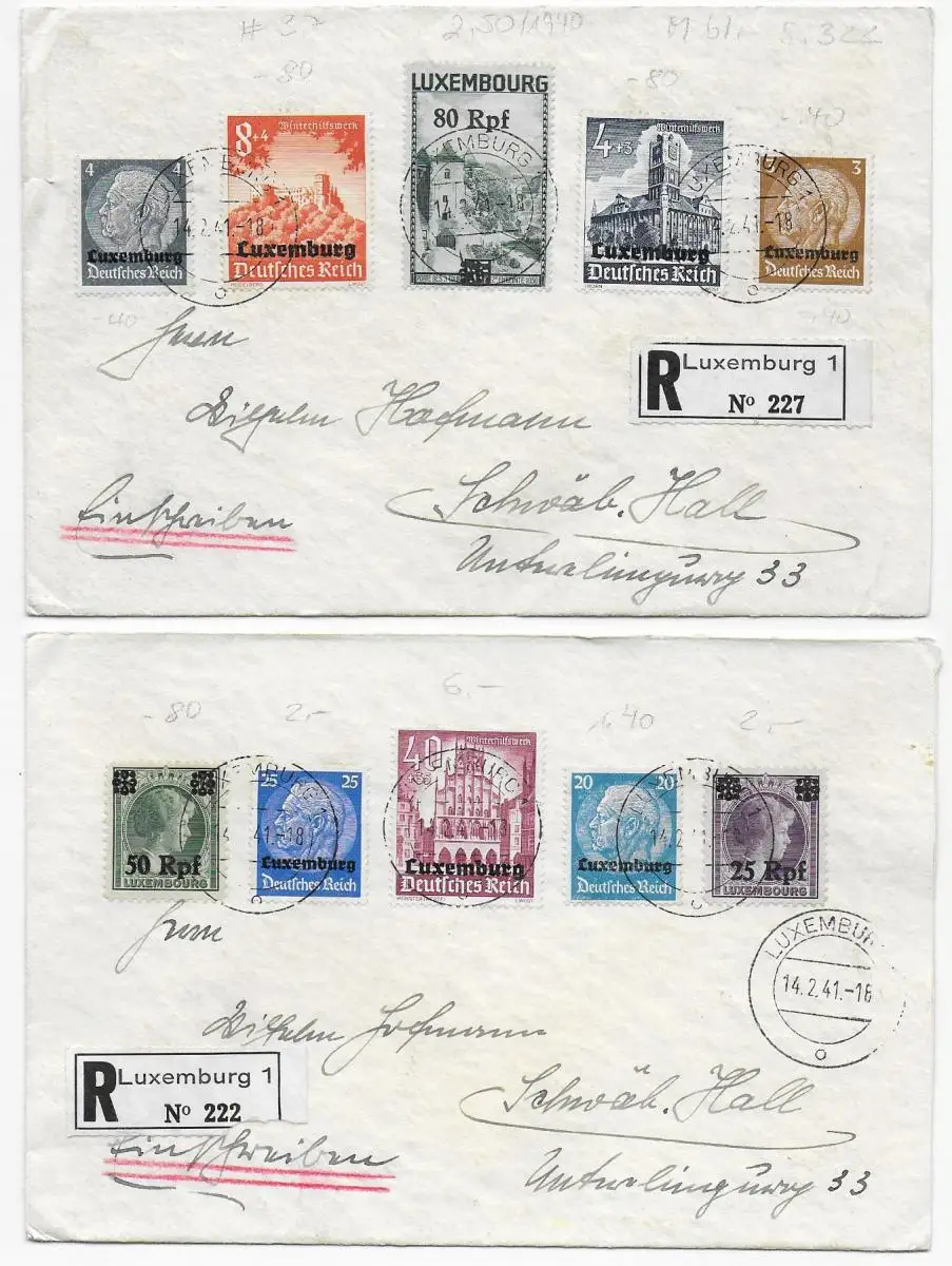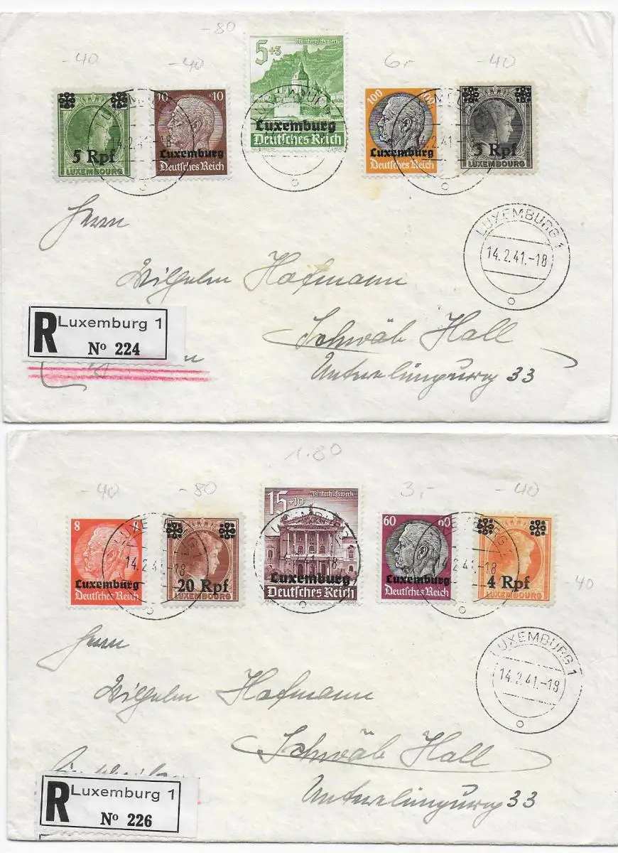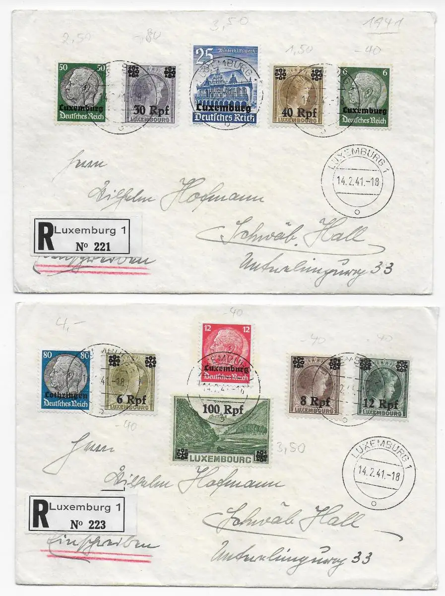 8 Briefe, Einschreiben Luxemburg, 1941 mit MiNr. 1-41 nach Schwäbisch Hall