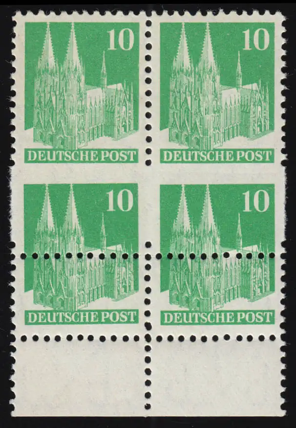 schöner postfrischer, ungefalteter Viererblock mit versetztem Kammschlag. Dadurch bleiben die oberen Marken unten ungezähnt, die unteren zeigen eine zusätzliche waagerechte Zähnungsreihe mittig durch das Markenbild. Schöne Einheit aus alter Heimatsammlung, erworben am 7.12.48 auf dem Postamt WALDNIEL (heute Schwalmtal, Niederrhein).