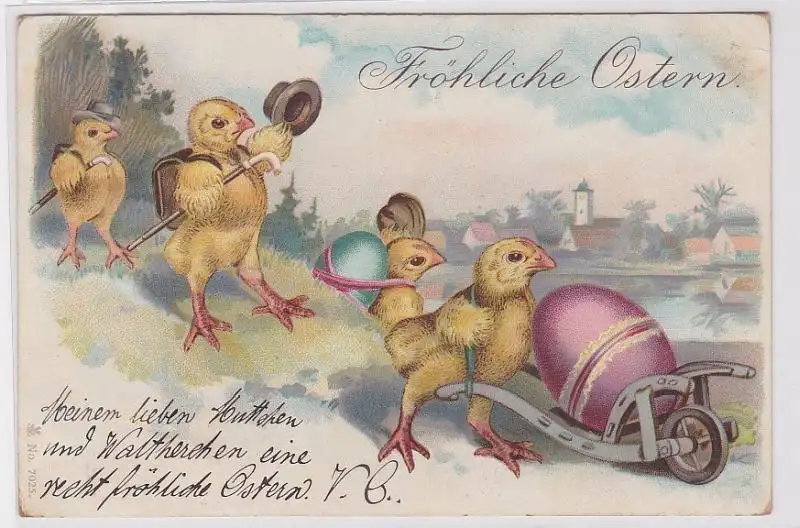 82145 Glückwunsch AK Fröhliche Ostern - Küken mit Hüten schieben Eierkarren 1900