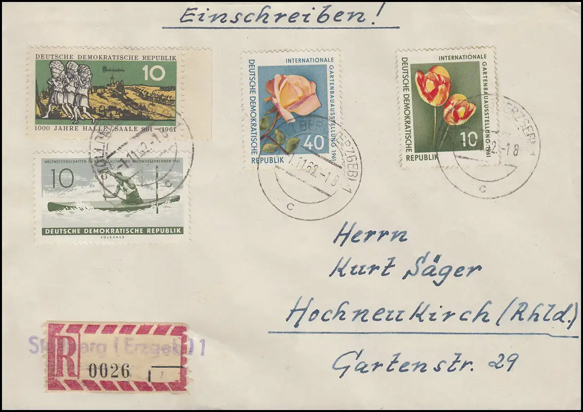 855-856 IGA 1961 in MiF mit 833+839 R-Brief Not-R-Zettel STOLLBERG/ERZ. 1.11.62
