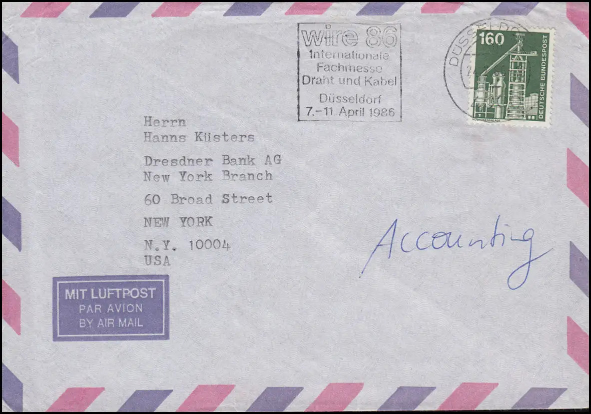 857 IuT Großhochofen 160 Pf als EF Auslandsbrief DÜSSELDORF 24.2.1986 in die USA