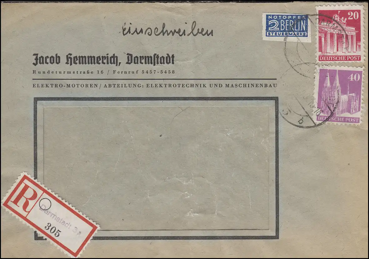 Fensterbrief-Umschlag mit schwacher Abstempelung mit Not-Einschreibe-Zettel vom Postamt Darmstadt 3 nach Worms.