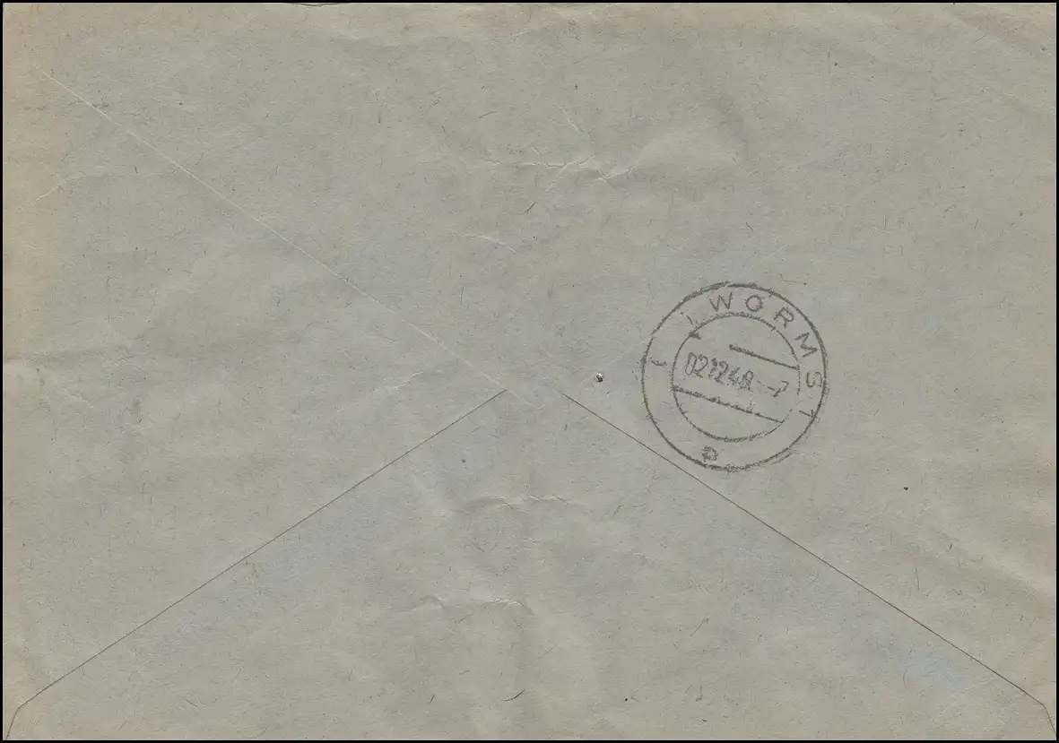 85wg + 90wg Bauten-MiF R-Brief Not-R-Zettel DARMSTADT 3 nach WORMS 2.12.48