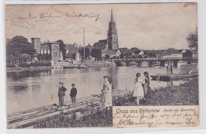 89373 AK Gruss aus Rathenow - Partie am Havelthor mit Bootsanleger & Kirche 1903