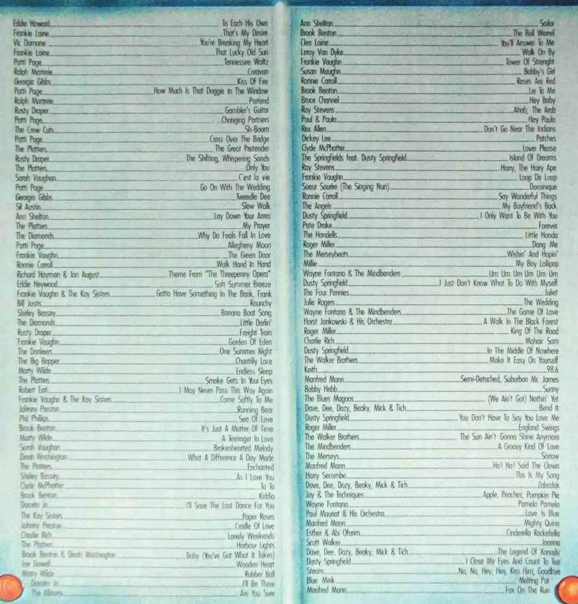 feat Walker Brothers Manfred Mann Blue Mink Steam Dave Dee Dozy beaky Mick & Tich Wayne Fontana Merseys Mindbenders Jay & Techniques Julie Rogers Keith Millie Dusty Springfield Roger Miller Horst Jankowski Hondeells Brook Benton Ann Shelton Frankie Vaughn Allisons Marty Wilde Platters The Big Bopper Diamonds Patti Page Shirley Bassey Crew Cuts Kay Sisters Frankie Laine Vic Damone usw...