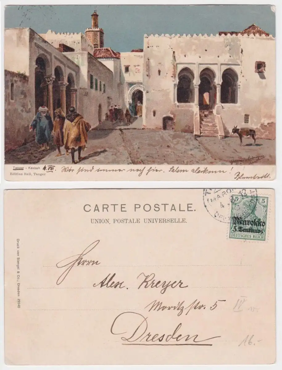 gelaufen mit 5 Centimos Marke Deutsche Auslandspostämter (Marokko) (Michel Nr. 20), gute Erhaltung, siehe Bild,