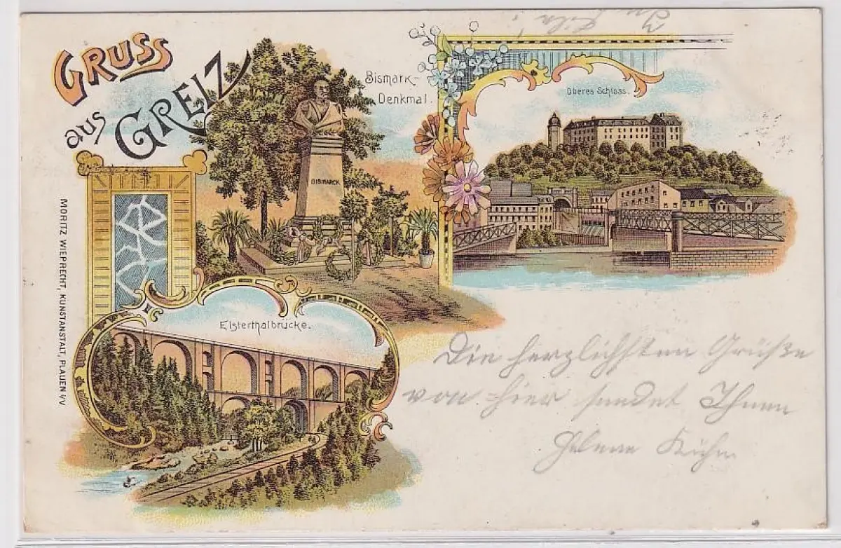 907194 Ak Lithographie Gruss aus Greiz Bismarckdenkmal usw. 1898