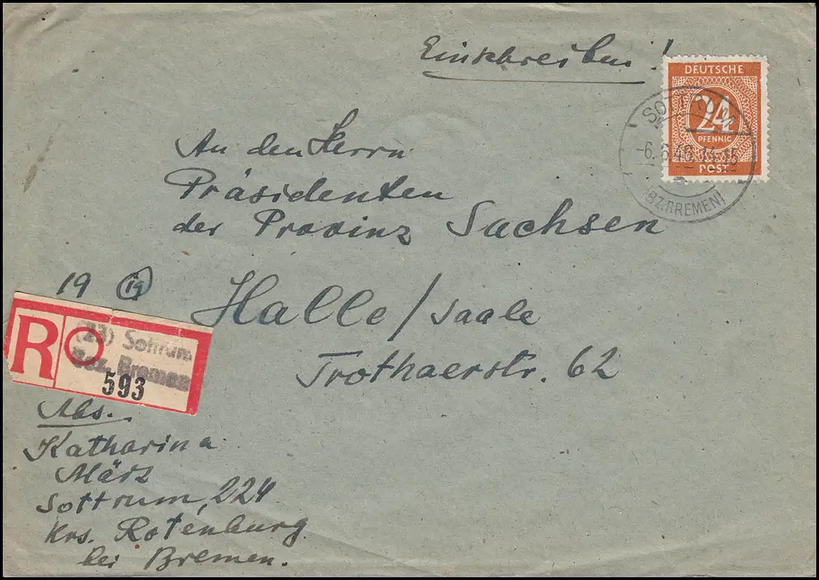 925 Ziffer mit 3 AM-Post MiF R-Brief Not-R-Zettel SOTTRUM (BZ.BREMEN) 6.6.1946