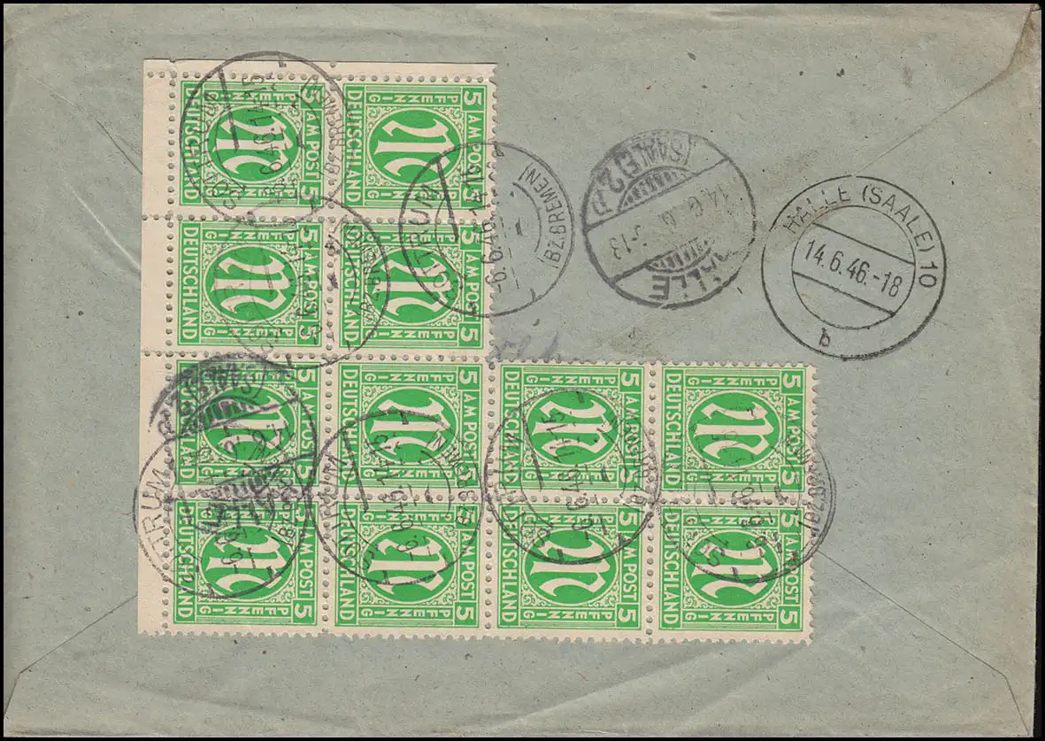 Die Einschreibegebühr wird duch die rückseitige AM-Post-Frankatur - 5 Pf. amerikanischer Druck im Bogenteil - abgedeckt, portogerecht, Ankunftsstempel HALLE/SAALE 2 p 14.6.46