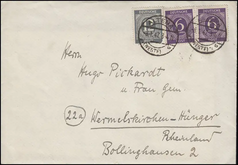 926+920 Ziffern 2x6 und 12 Pf. MiF Bf ALTENA / WESTF. 8.1.47 nach Wermelskirchen