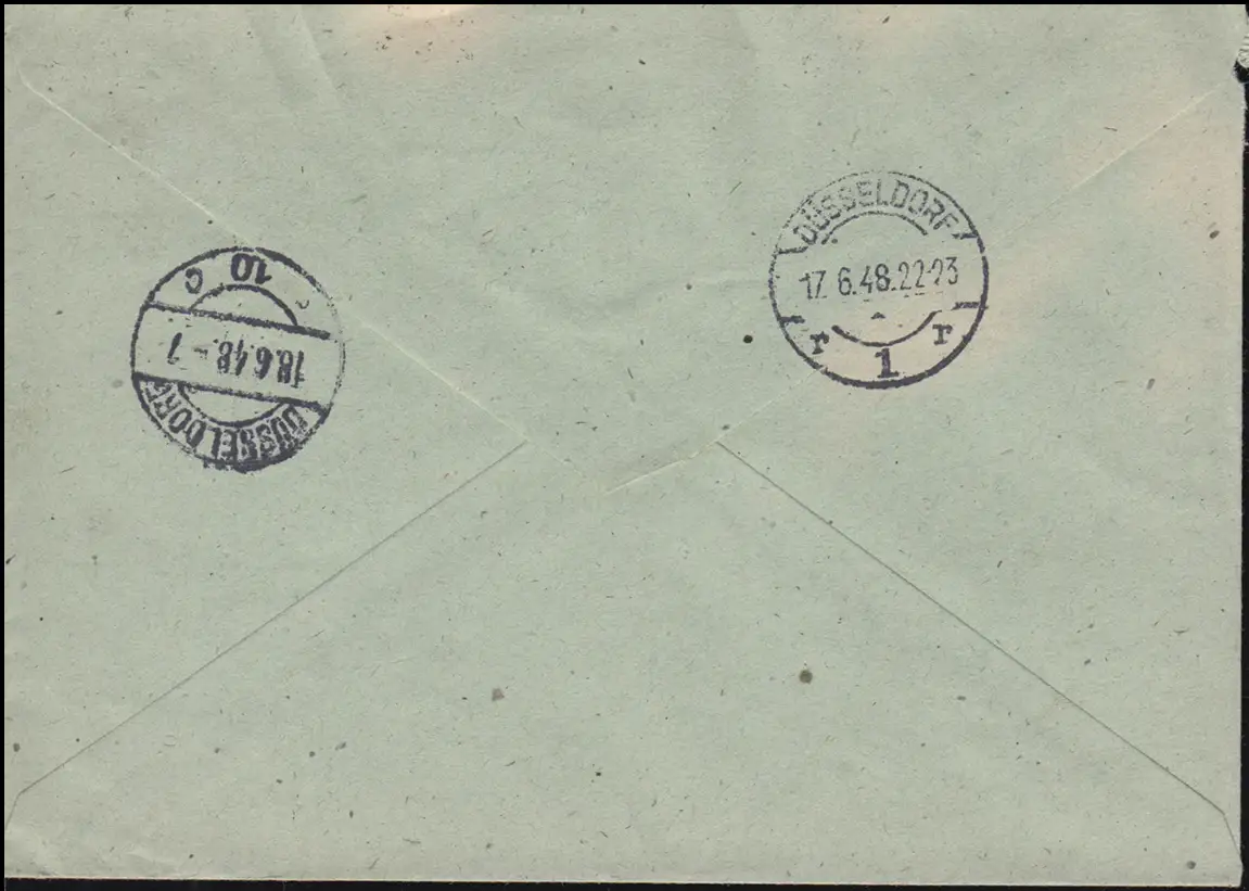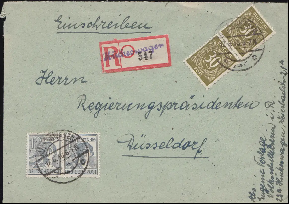 Portogerechte Mischfrankatur auf Brief im Fernverkehr als Einschreiben an den Regierungspräsidenten in DÜSSELDORF18.6.48.