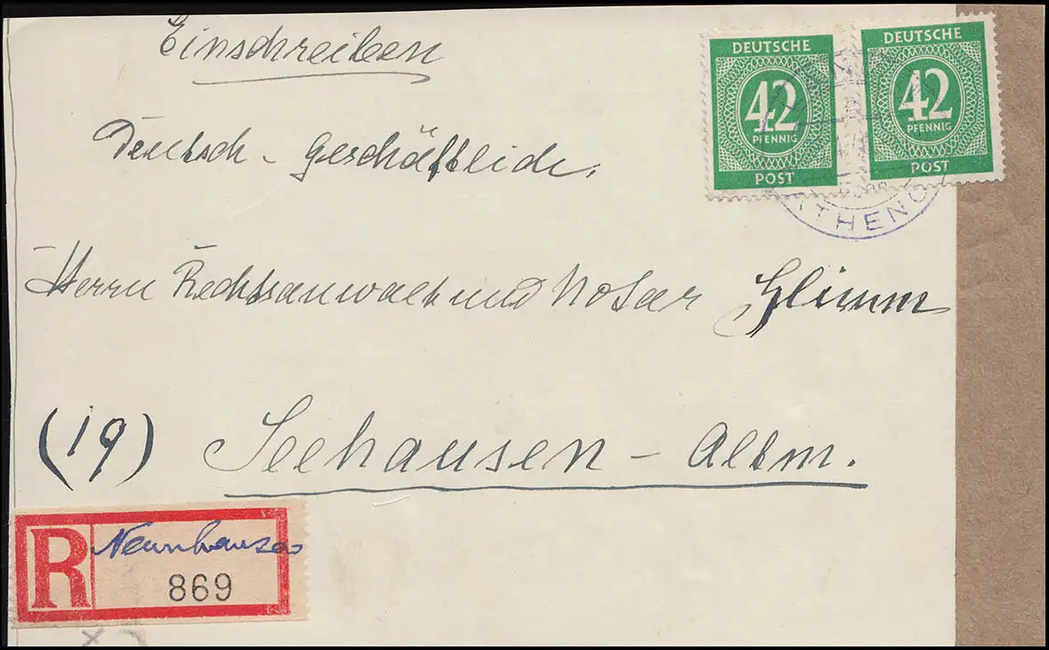 zwei 42-Pfennig-Marken als Doppelfrankatur auf Briefstück, portogerecht, seltene Verwendung!