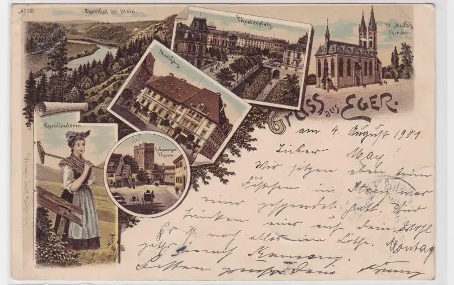 94767 Ak Lithographie Gruß aus Eger Theaterplatz usw. 1901