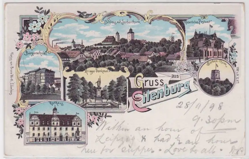 96572 Ak Lithographie Gruss aus Eilenburg Bürgerschule, Post usw. 1898