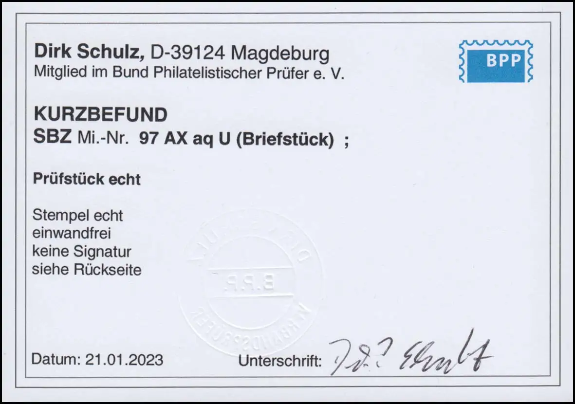 97AXaqU Schiller 12 Pf. ungezähnt O Briefstück, Befund Schulz BPP
