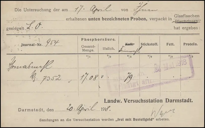 99 Germania EF Postkarte Landw. Versuchsstation DARMSTADT 20.4.18 n. Kriegsfeld