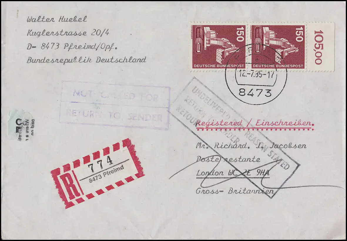 992 IuT 150 Pf. als senkreches OR-Paar auf R-Auslandsbrief PFREIMD 12.7.85