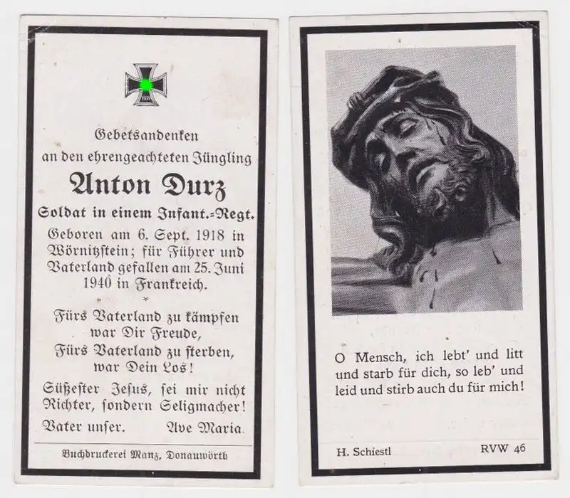 99201 Sterbebild WK2 Soldat Infanterie Regiment gefallen in Frankreich 1940