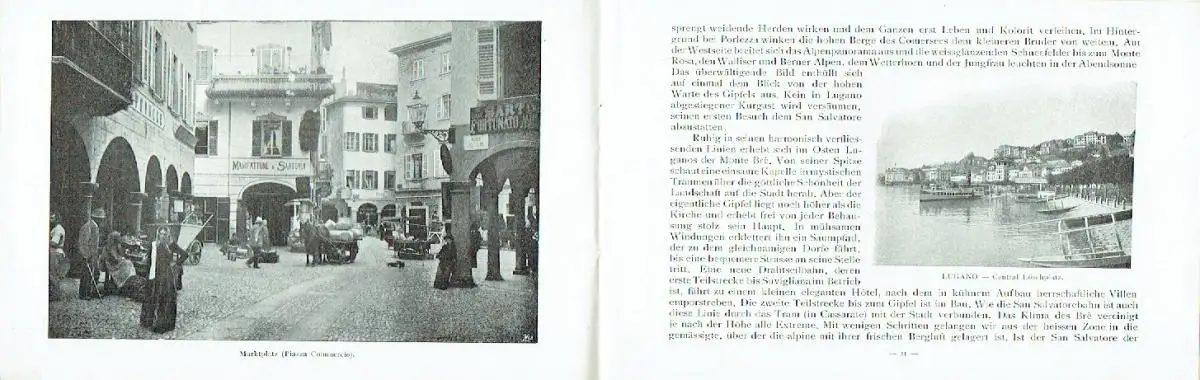 guter Zustand, Gebrauchs- und Alterungsspuren: Umschlag leicht verschmutzt - Deckel mit Herausgeberstempel und Signum links oben - Umschlag und Seiten teils etwas eselsohrig - Seiten sauber und ordentlich, selten mit kleinen Randblessuren - letzte Seite entlang des Falzes leicht beschädigt - eine im Inhaltsverzeichnis erwähnte Beilage mit Hotelpreisen fehlt, Lugano - Klima - Temperatur-Tabelle 1907-1909 - Meteorologische Feststellungen - Lage - Umgebung - Schiffsverkehr und Zahnradbahnen - Die Stadt - Benennung von 75 Sehenswürdigkeiten und öffentlichen Gebäuden, welche auf dem Plan mit Nummer markiert sind - Verschiedene Tarife (Gepäck, Paket, Kutschen, Gondeln) - Adressen von Banken, Konsulaten und Ärzten, kartoniert, ca. 18,5 x 12, 48 Seiten mit zahlreichen Bildern, einer Karte der drei Seen und einem Stadtplan