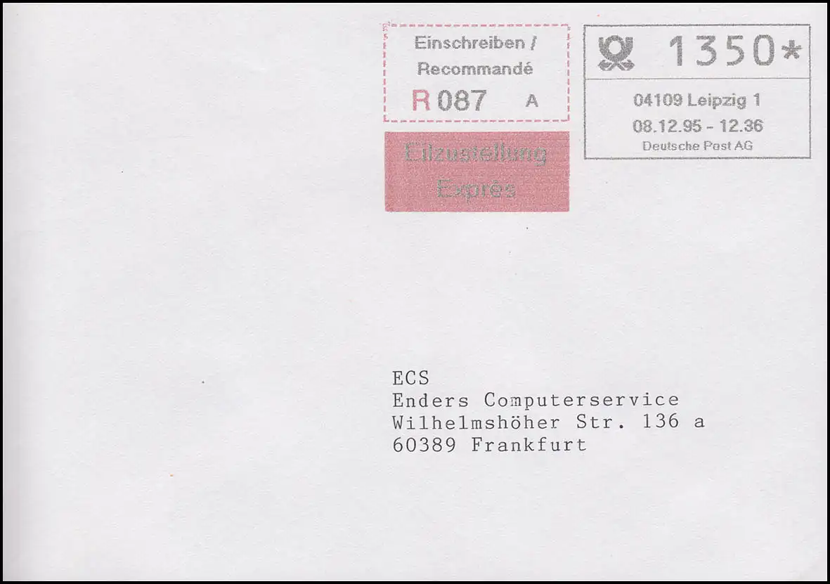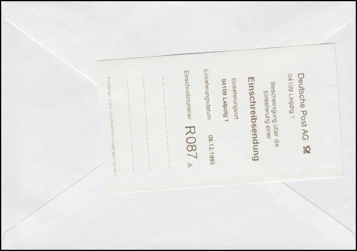 ABAS Das erste automatische Briefannahmesystem LEIPZIG als R-Eil-FDC 8.12.1995