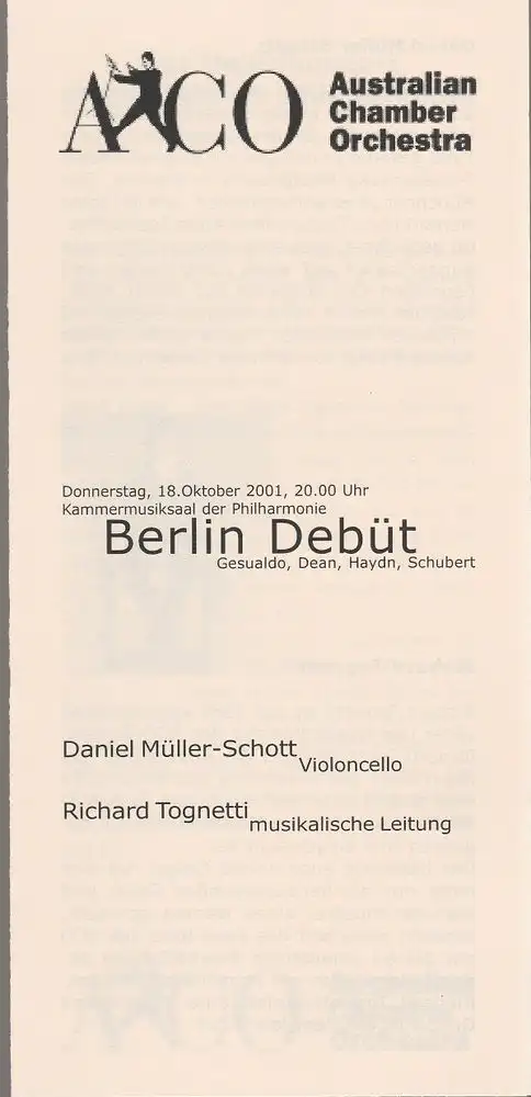 Titel: Programmheft AUSTRALIAN CHAMBER ORCHESTRA 18. Oktober 2001 Kammermusiksaal Philharmonie