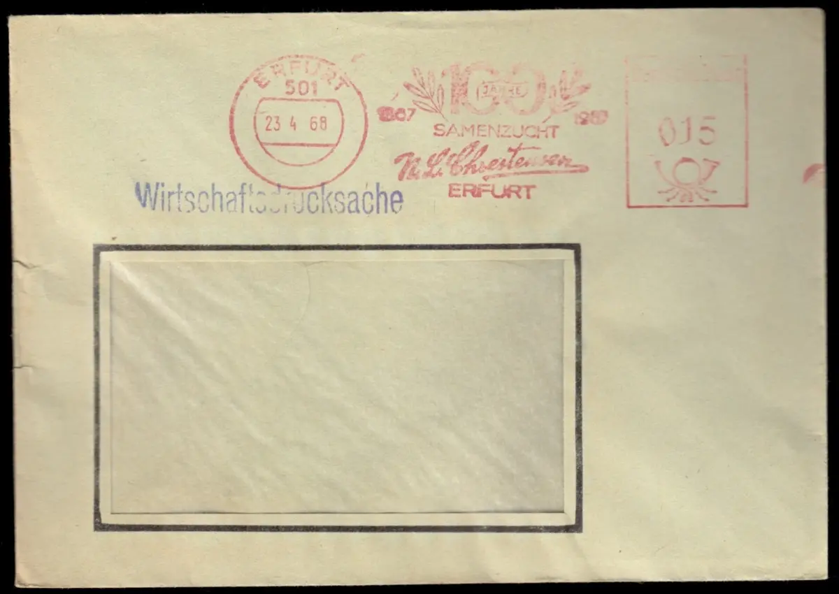 Absenderfreistempel1867 - 1967 100 Jahre Samenzucht N.L. Chrestensen, Erfurt Abbildungen: Blätter Absender: Samenzucht N.L. Chrestensen, Erfurt Empfänger: unbekannt, Fensterbrief Nebenstempel: Wirtschaftsdrucksache Anmerkungen: keine Im Inland erfolgt die Zusendung versandkostenfrei als Briefsendung der Deutschen Post AG oder eines privaten Postanbieters. Auslandsversand erfolgt über
