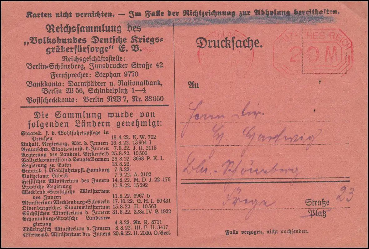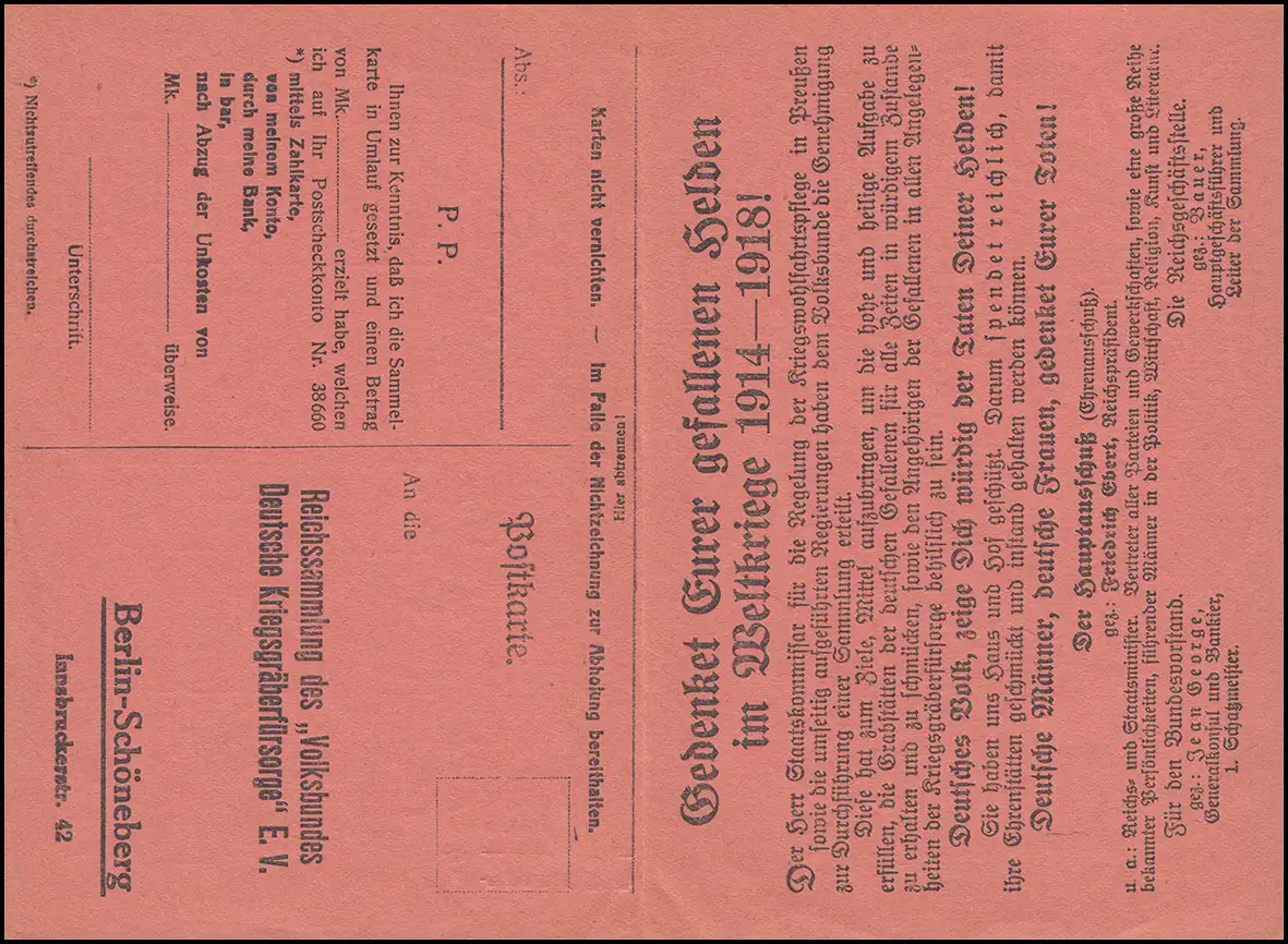 Portogerechte Absenderfreistempelung auf Drucksache mit Antwortkarte: Reichssammlung des Volksbundes Deutsche Kriegsgräberfürsorge e.V. in Berlin-Schöneberg, Werbetext: Gedenkt Eurer gefallenen Helden im Weltkriege 1914-1918!